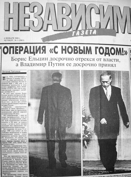 С.О. — Разговор о годе, который венчал XX век и II тысячелетие, следует все же начать с 31 декабря 1999 года, когда президент России Борис Ельцин, большой мастер «спецэффектов», совершил, пожалуй, самую сенсационную, как он любил выражаться, «рокировочку». В прямом эфире, когда все ждали от него исключительно новогоднего поздравления, Борис Николаевич сообщил, что досрочно слагает с себя полномочия главы государства и представил преемника — председателя правительства Российской Федерации Владимира Путина.