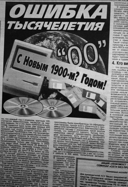 В.М. — Да, этой темой долго пугали рядовых компьютерных пользователей. Основывалась она, упрощенно говоря, на том, что компьютер воспринимает любую информацию как скопище единичек и ноликов. Было опасение, что переход в нумерации года на почти сплошные нули приведет к серьезному сбою в компьютерных программах. Речь преимущественно шла о системах, завязанных в единую сеть — например, в энергетике, в транспортной сфере и так далее.