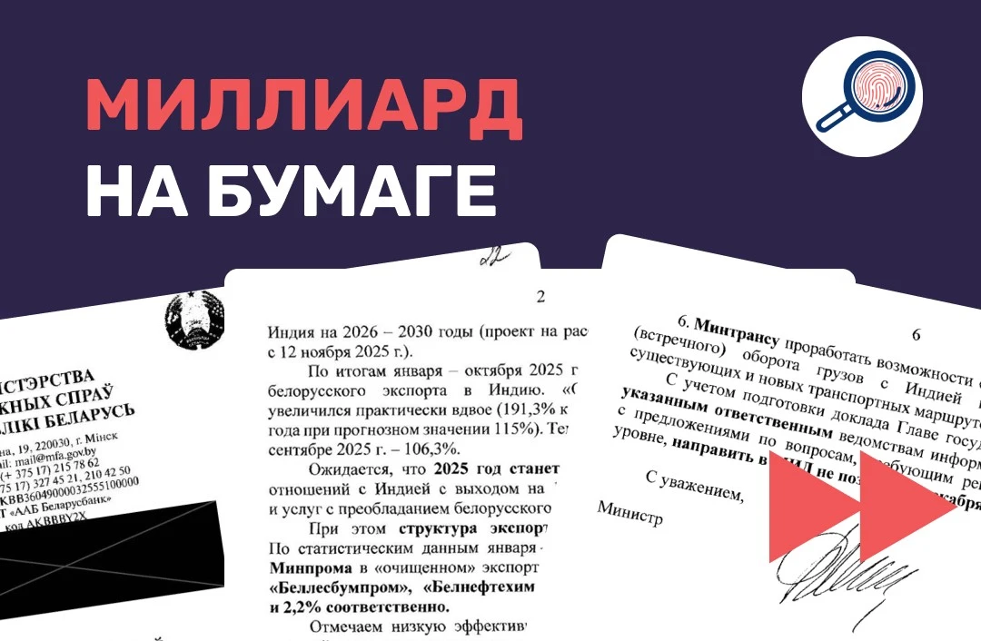 В служебной записке беларуского МИД о сотрудничестве с Индией, оказавшейся в распоряжении BelPol, торжественно заявляется: «2025 год станет рекордным» — товарооборот якобы должен выйти на уровень 1 млрд долларов. В документе это подается едва ли не как главный внешнеэкономический прорыв десятилетия.