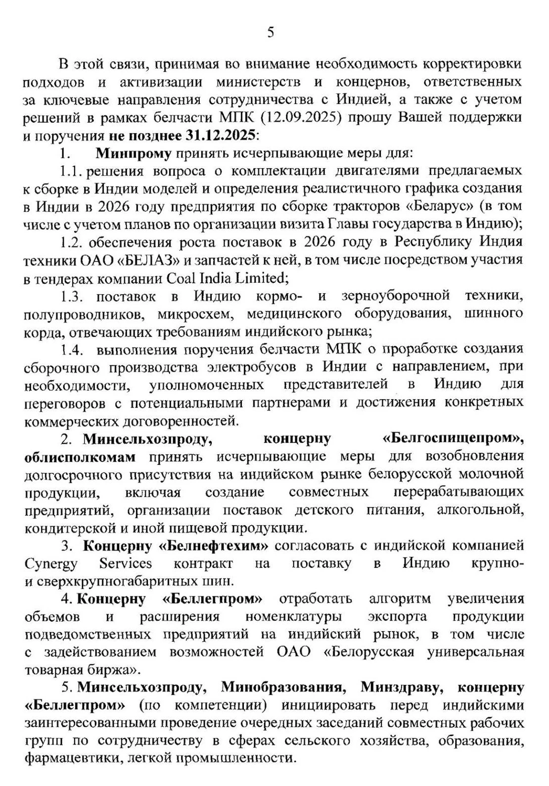 Отдельного внимания заслуживает история сборки тракторов МТЗ в Индии. Этот проект обсуждается с 2017 года. В документе прямо указано, что проект «остается на уровне деклараций», а «поручение главы государства до настоящего времени не выполнено».