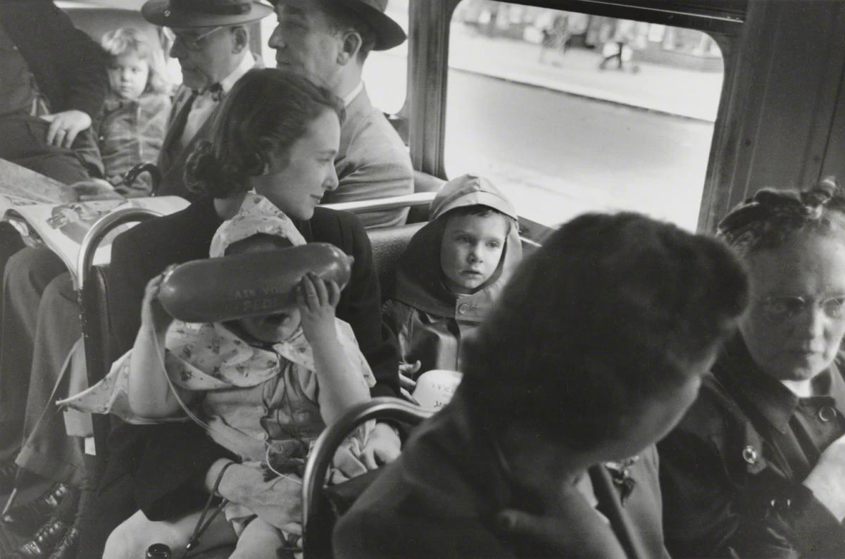 Эстер создала проект «История автобуса», фотографируя американцев-патриотов, «приносящих жертвы»: бросающих комфортные авто и пересаживающихся на общественный транспорт. Что патриотично экономило бензин и резину для военных нужд.